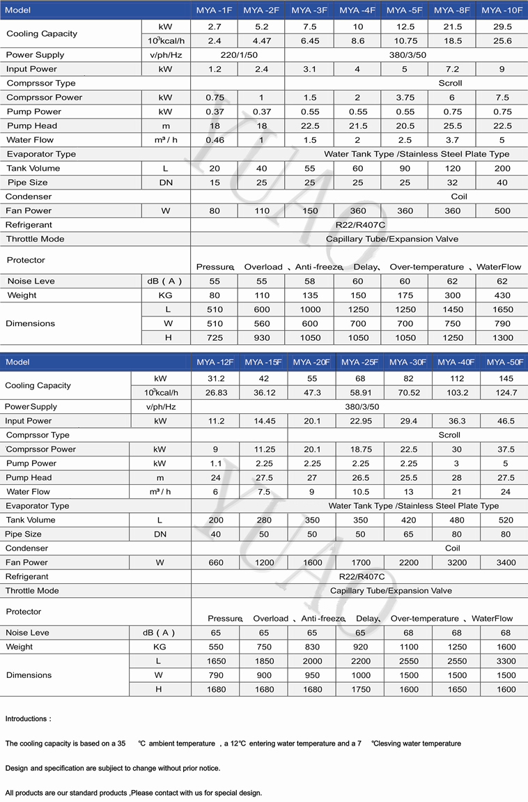 MYA-F Series air-cooled industrial chiller selection of international brands and refrigeration compressor parts,the use of advanced cutting-edge technologies air-conditioning refrigeration controls,to achieve high energy efficiency,energy saving and environmental protection.This series is mainly used in air-colled industiral chiller impurities less dust,water quality,water and other poor or need to save space,the key to industrial production processes for industrial production of high-precision temperature chilled water medium,in order to continuously improve the efficiency of industrial production to provide continuous cooling capacity!