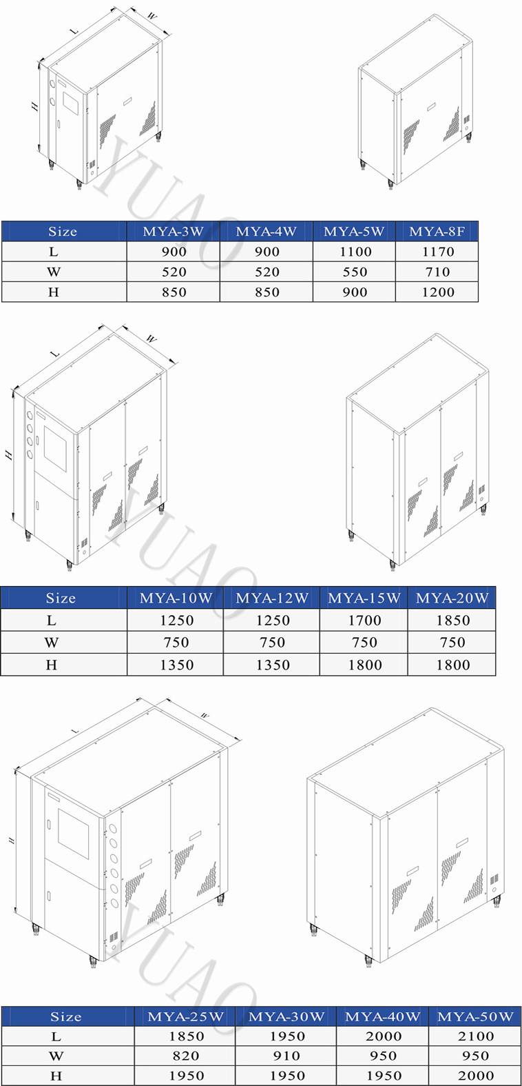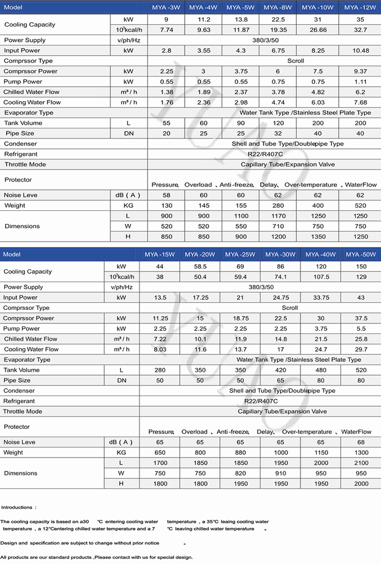 MYA-W Series Water-cooled industrial chiller selection of international brans and refrigeration compressor parts,air-conditioning refrigeration control over the use of advanced cutting-edge technology,to achieve high energy efficiency,energy saving and environmental protection.This series of water-cooled industrial chiller is mainly used in high ambient temperatures,gray dust and more poor ventilation,water-rich large space such as a separate type or a centralized key link in the process of industrial production for industrial production of high-precision temperature chilled water medium,in order to increase efficiency in industrial production to provide continuous cooling capacity!" |