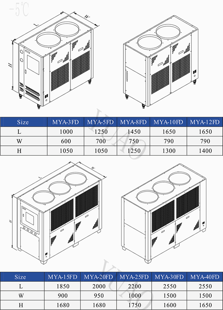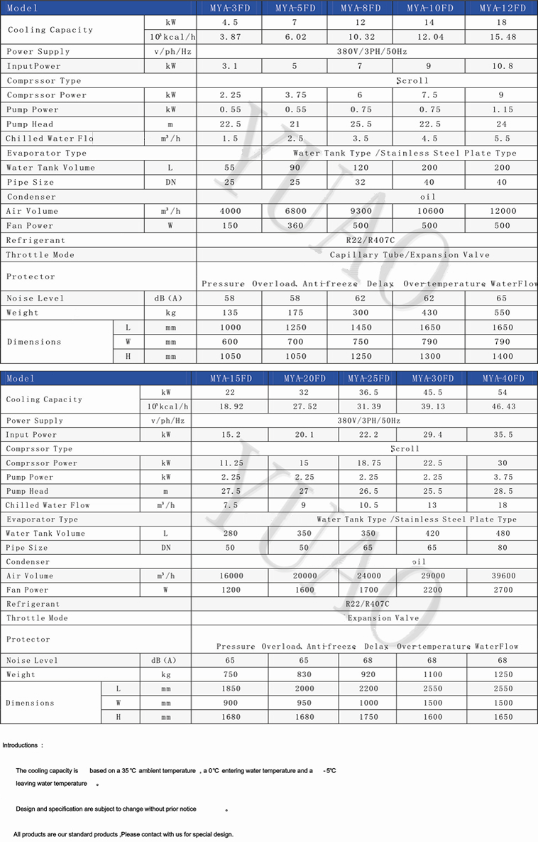MYA-FD Series of low temperature air-cooled industrial chiller selection of internationally famous brand "MANEUROP" low-temperature compressor and refrigeration parts,refrigeration control over the use of advanced cutting-edge technology to achieve high energy efficiency,energy saving and environmental protection.This series of low-temperature air-cooled industrial chiller mainly for industrial processes to provide the key to -5℃. contained in the low temperature cooling agent(ethylene glycol or brine) media,in order to continuously improve the efficiency of industrial production to provide continuous "freezing" power! |